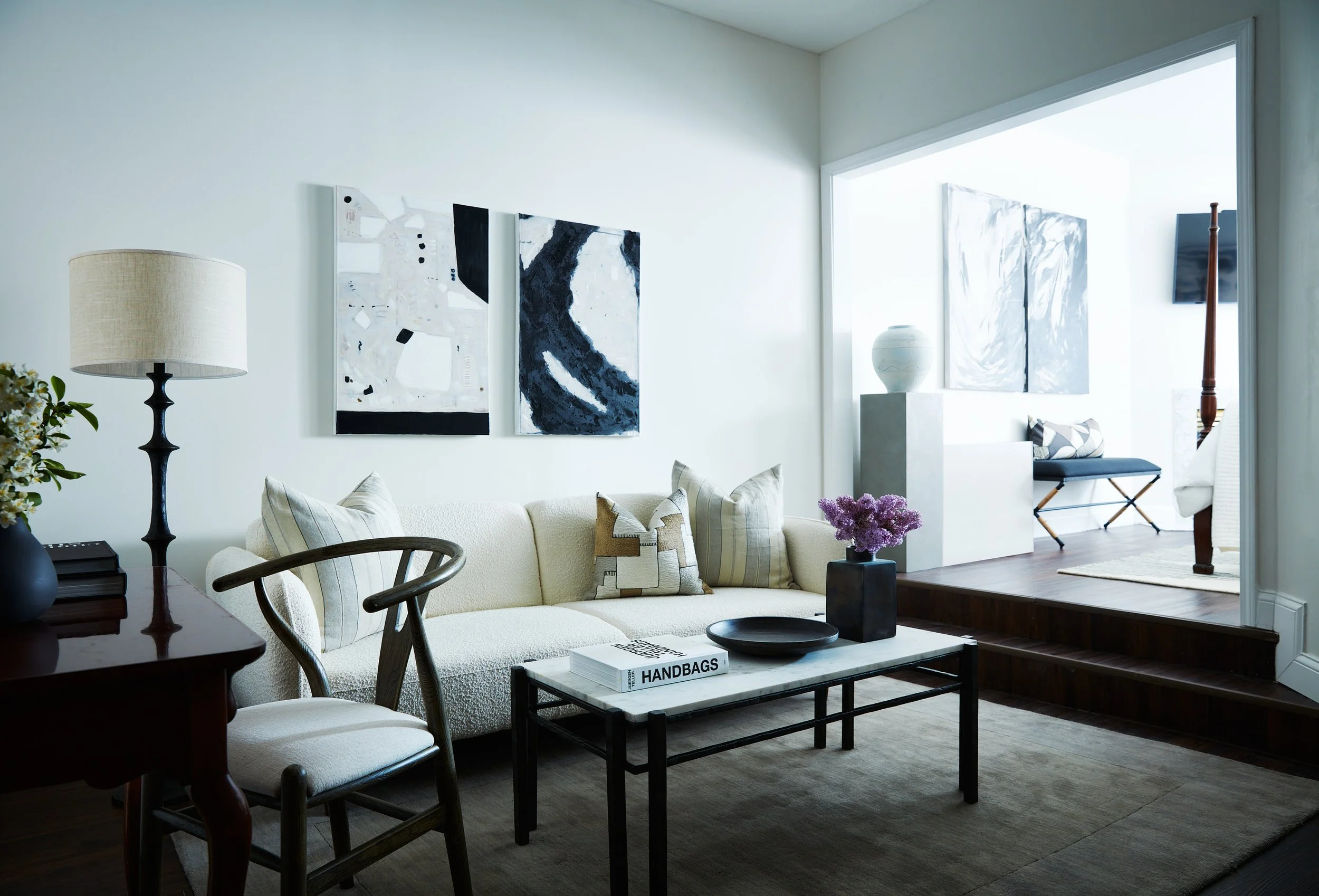 Pictured is Room Eight. Christian Siriano artwork, custom Siriano pillows, and thoughtfully furnished that creates a space that exudes luxury and freshness.